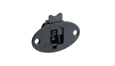 Piece de guidage a visser pour armoire avec 1 porte suspendue (semi-suspendue) et 1 porte insérée. 2 pieces de guidage sont nécessaires par porte. Linguet avec ressort et sécurité contre le desserrage. Plastique gris.