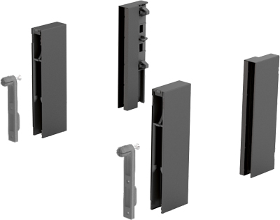 Pour une hauteur de côtés de 94 et une hauteur de dos de 218 mm ainsi que pour une hauteur de côtés de 126 et une hauteur de dos de 250 mm. L'ensemble d'adaptateurs DesignSide comprend : 1 paire - adaptateur avant et arriere couleur anthracite, incluant les fixations pour panneau a enfoncer et a visser.