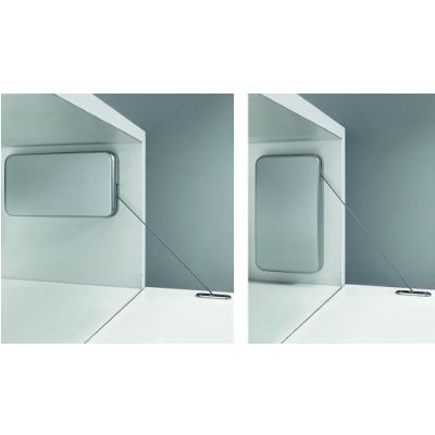 Quincaillerie pivotante 100N avec câble de traction pour porte en bois ou porte avec cadre en bois. Amortissement pour l'ouverture et la fermeture. Poids de la porte y compris la poignée 1,4-14,5 kg. Hauteur de la porte 200-480 mm. A visser sur le côté du corps, a droite ou a gauche. Utilisation horizontale et verticale selon l'espace. Les portes abattantes doivent etre équipées en bas de charnieres a cupule ou de charnieres pour portes pliantes (a commander séparément). Les caches doivent etre commandés séparément.