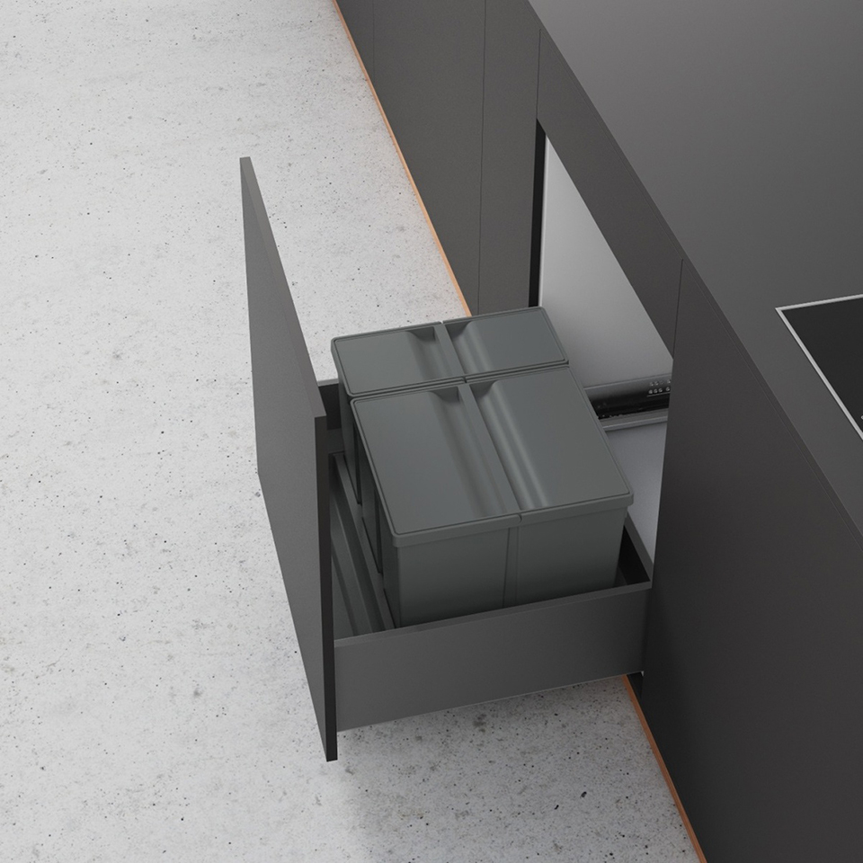 Ensemble trieur en deux parties a poser dans un tiroir haut AvanTech YOU et ArciTech (NL 450/500mm) ou InnoTech Atira (NL 420/470mm). Pour une largeur de corps de 600mm. Volume 37 litres. Hauteur d'encastrement 297mm a partir du bord supérieur du fond du tiroir. La cuve insérée peut etre recoupée (largeur 430-540mm, profondeur 399-490mm). Cuve, récipient et couvercle en plastique anthracite.