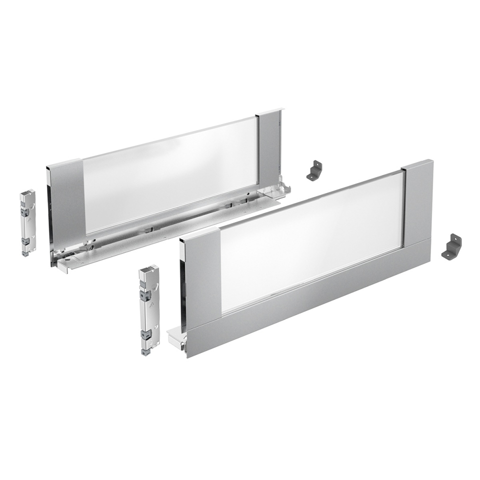 Ensemble de supports pour matériau individuel du systeme AvanTech. Toute matiere d'une épaisseur de 8 mm peut etre utilisée comme remplissage. Hauteur 187, longueur 450 mm. Couleur argentée. L'ensemble comprend : supports avant et arriere L+P, supports de fond et de tiroir L+P, supports de façade a vis, stabilisateur arriere. A utiliser avec les tiroirs coulissants Quadro You ou Actro You.