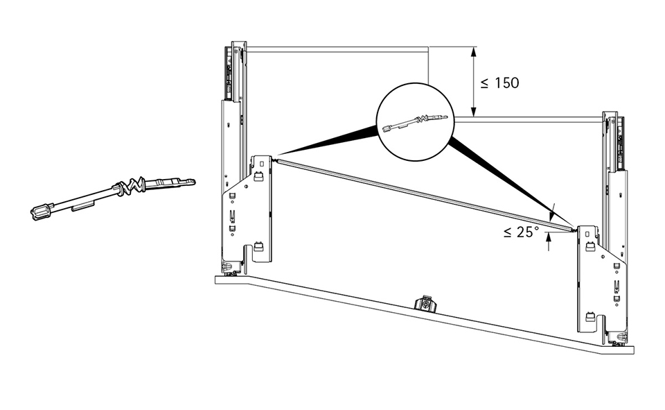 L'ensemble permet le positionnement oblique de la barre de synchronisation pour tiroirs avec façade oblique. Il remplace l'adaptateur de synchronisation dans l'ensemble Push to open Silent. L'angle maximum est de 25°, avec un décalage de profondeur max. 150 mm.