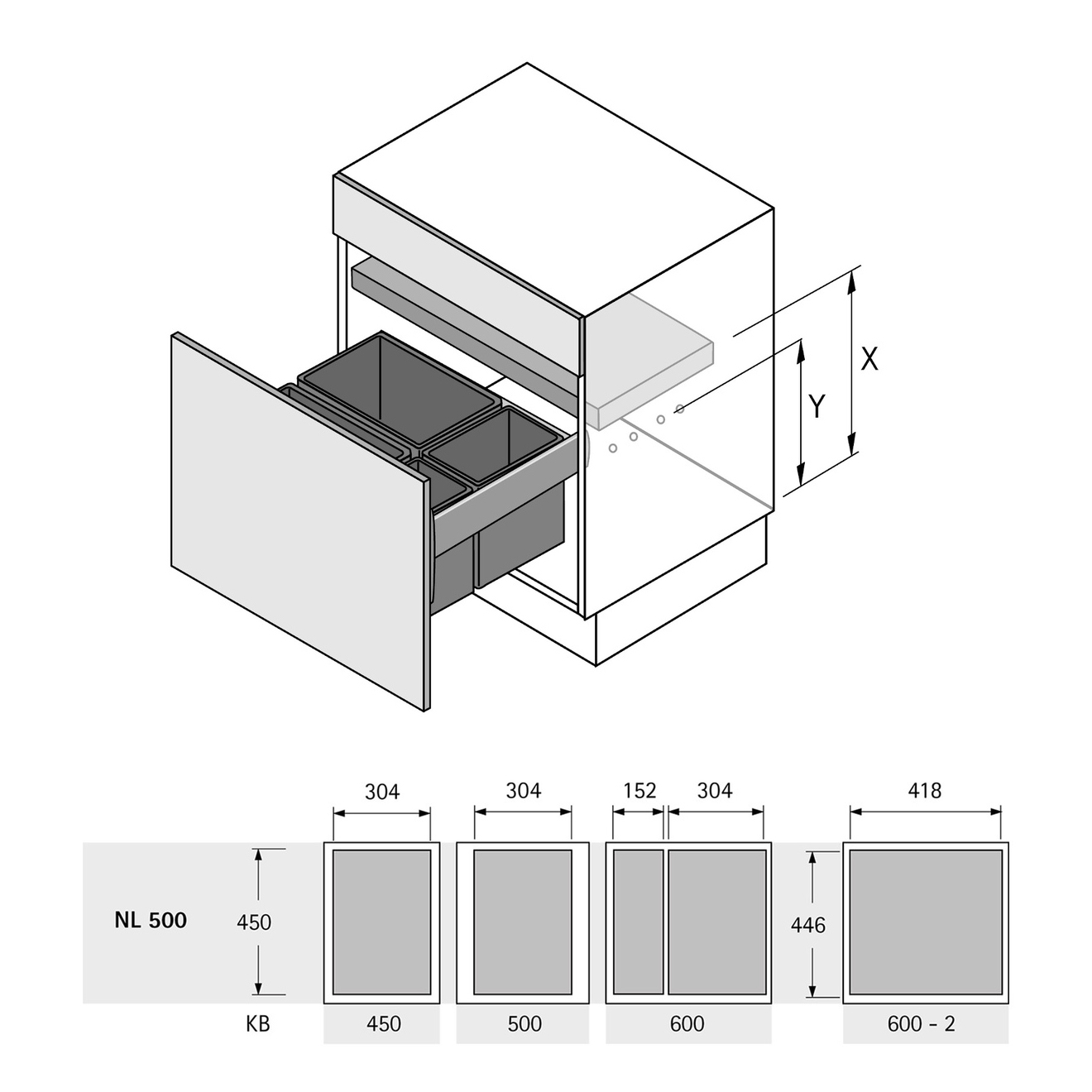 Systeme suspendu pour déchets pour tiroirs AvanTech YOU - KB=450mm, NL=500mm, hauteur des côtés 101mm. Au lieu du fond du tiroir, on insere le cadre AvanTech YOU Pull, qui peut etre équipé individuellement avec différents bacs et accessoires. Acier, peinture en poudre anthracite.