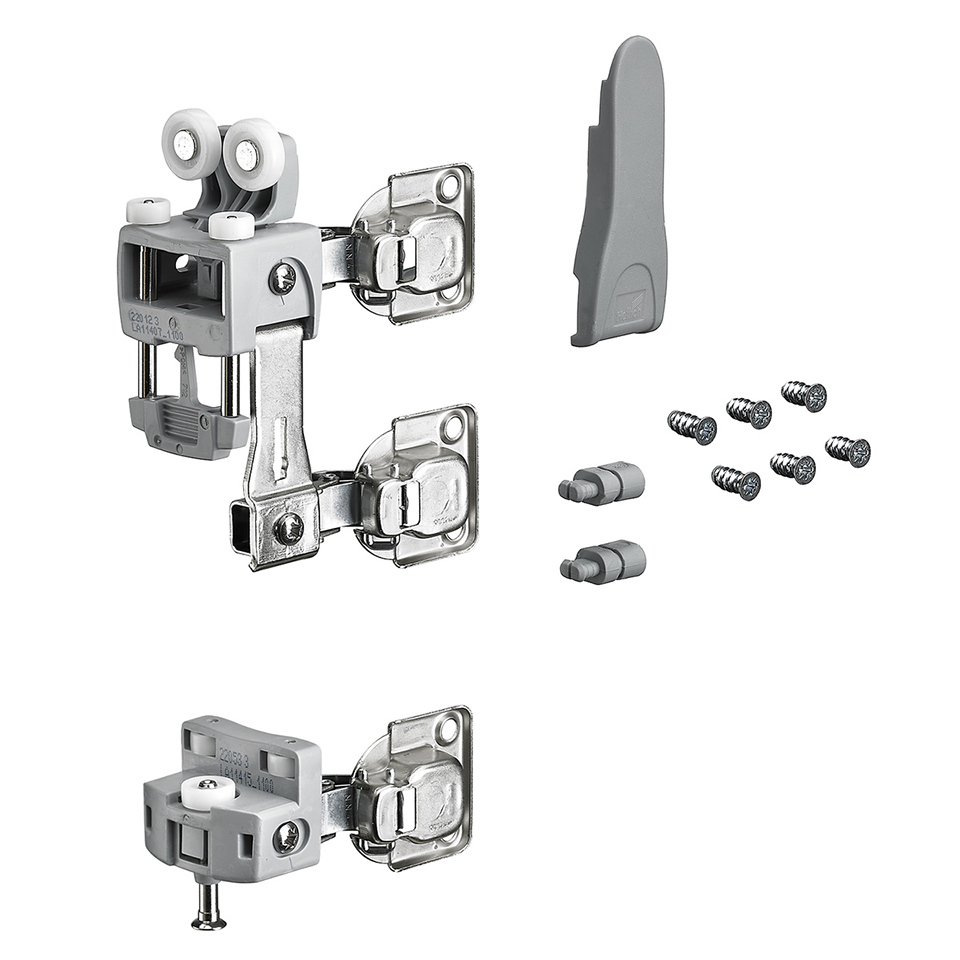 L'ensemble comprend un chariot porteur, un guide et le matériel de fixation pour une porte pliante a 2 vantaux, sans charnieres pliantes. Il est nécessaire de commander séparément les charnieres pliantes, les profils de guidage, les charnieres pour fixation murale et le mécanisme d'ouverture, voir la gamme associée.