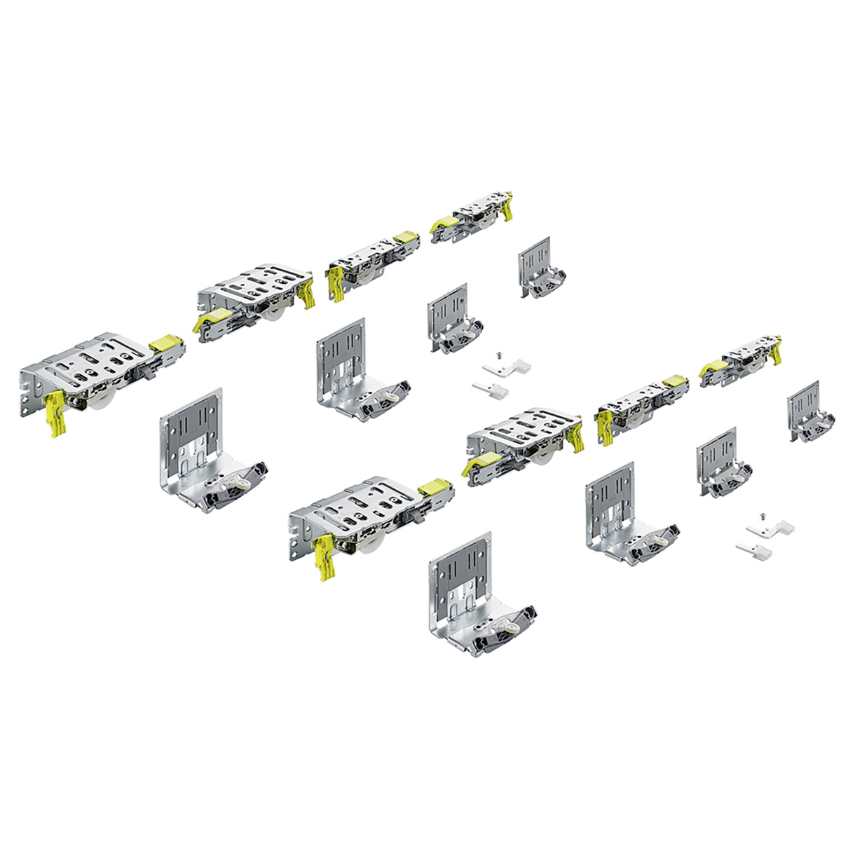 Ensemble de ferrures TopLine XL pour armoire a quatre vantaux. Pour épaisseur de matériau des vantaux de 18 - 30 mm, capacité maximale 60 kg (par vantail). Guidage inférieur STB 19 avec décalage du bord inférieur du vantail par rapport au sol de 33 mm.
