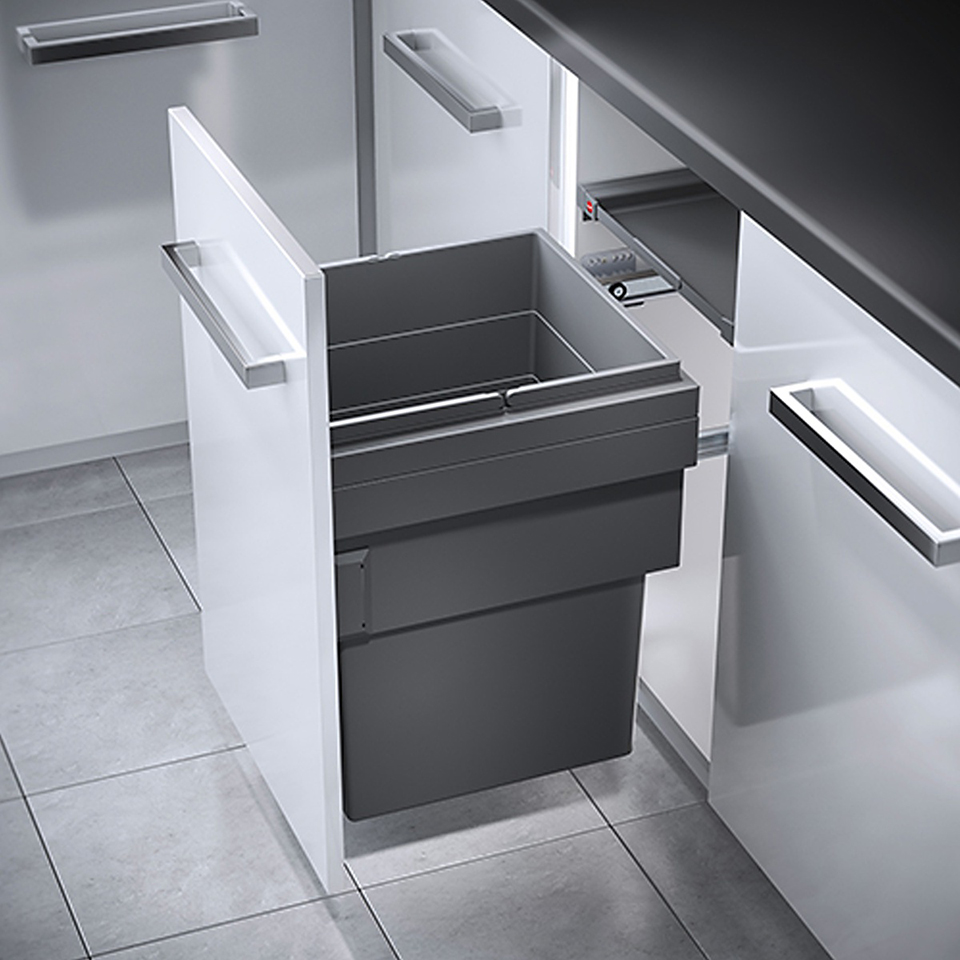 Systeme suspendu en haut pour poubelle avec coulisse a sortie totale avec amortisseur synchronisée et recouvrement Actro SiSy. Montage sur le côté du corps ép. 16-19mm. Comprend un couvercle coulissant métallique, entierement recouvert d’un tapis antidérapant en caoutchouc. Cadre et couvercle - acier, peinture en poudre gris foncé. Bacs, couvercles individuels et tapis en caoutchouc - plastique gris foncé. Profondeur d'encastrement réduite laissant suffisamment d'espace pour les tuyaux d’évacuation, les raccords d'eau et les appareils sous le plan de travail.