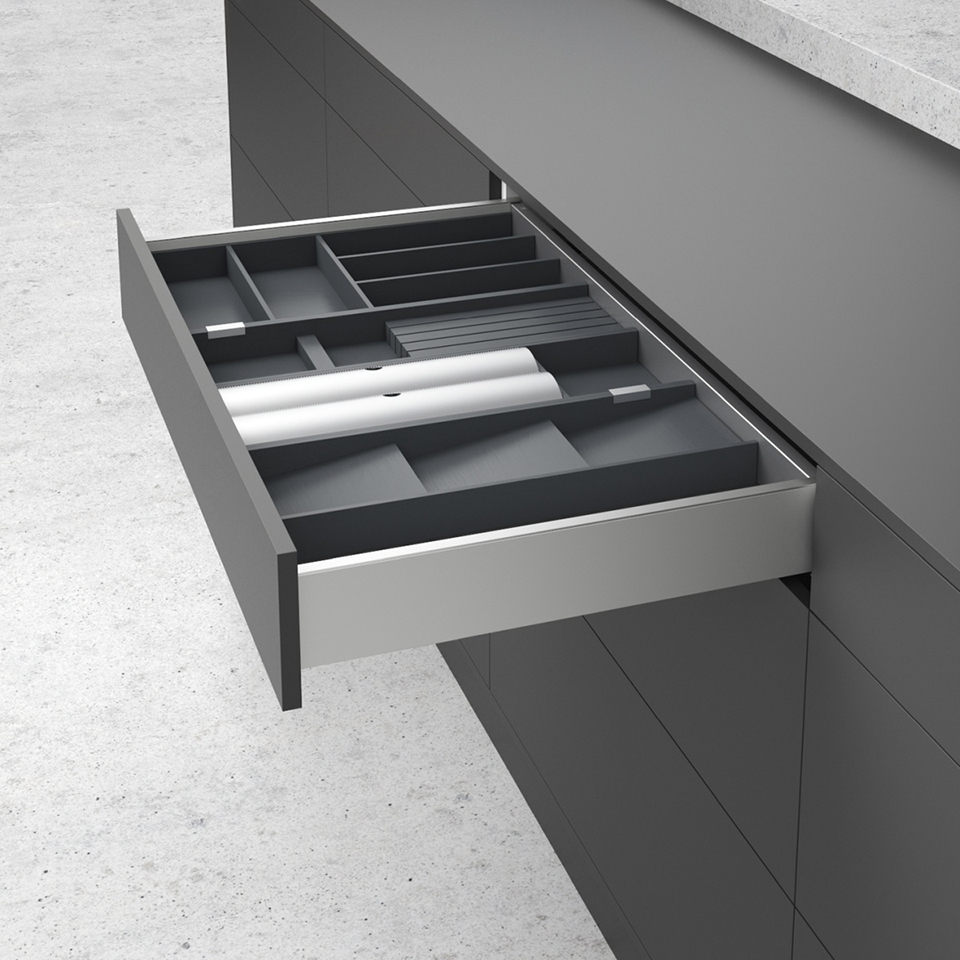 Réservoir pour papier aluminium et feuille avec coupe intégrée pour tiroirs NL=450 ArciTech et AvanTech YOU, InnoTech Atira. Peut etre combiné avec OrgaTray 630. Grâce a la combinaison des différents éléments, différentes largeurs de caisson sont possibles. Nous recommandons d’utiliser un tapis antidérapant. Hetre vernis anthracite, LxHxP = 150x43x423mm.