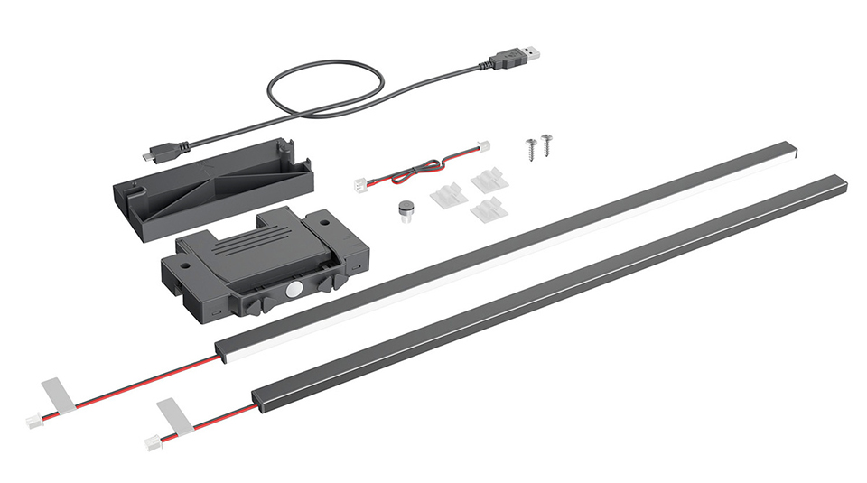 Éclairage décoratif exceptionnel pour AvanTech YOU, s'éclairant soit dans le tiroir, soit dans la piece. Peut etre installé ultérieurement en tant qu'accessoires optionnels pour la hauteur systeme 101/139/187/251 mm. Peut etre raccourci jusqu'a une longueur de NL 650 mm. Lumiere diffuse, température de couleur 4000 K. Un ensemble par tiroir, comprenant une batterie rechargeable, recharge via micro USB. Éclairage automatique a l'ouverture du tiroir, s'éteint a la fermeture du tiroir.