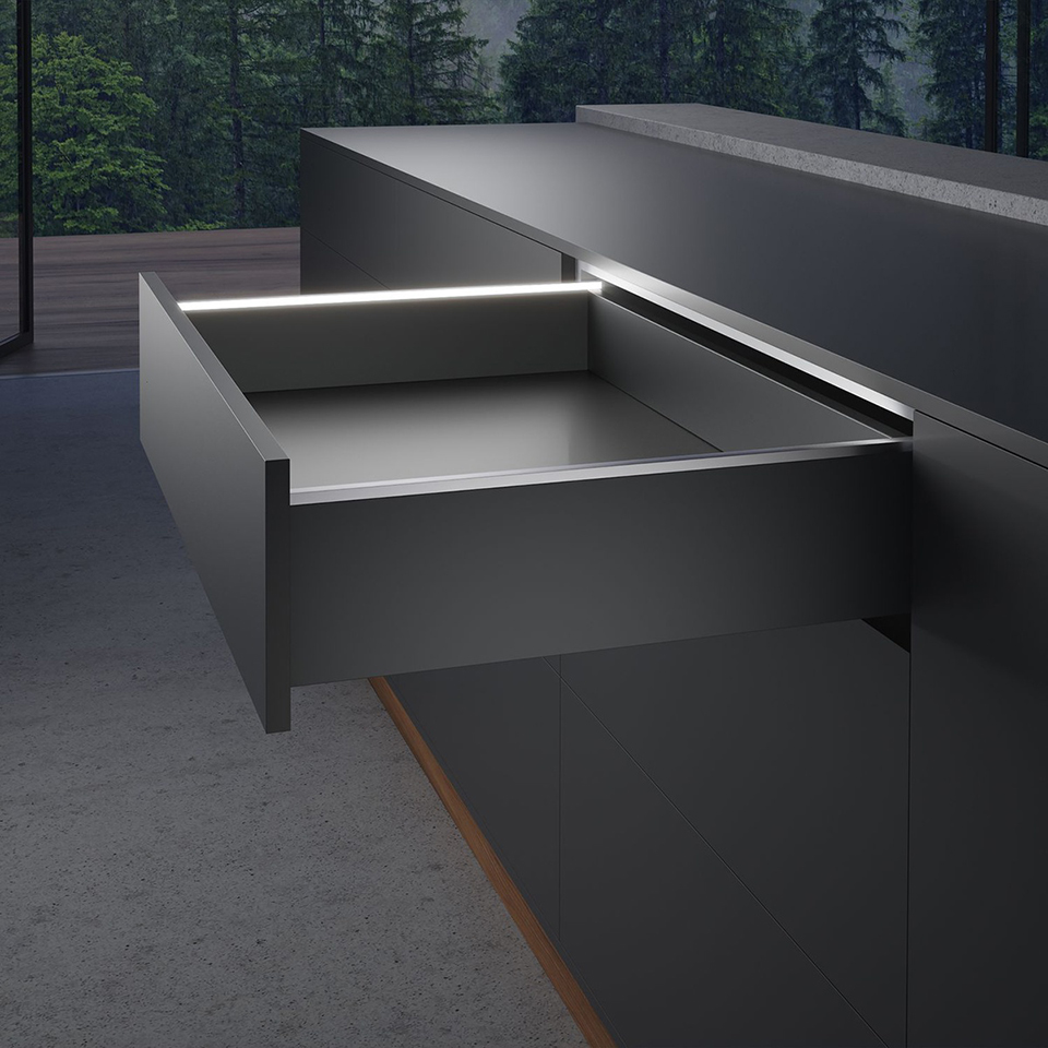 Éclairage décoratif exceptionnel pour AvanTech YOU, s'illumination soit dans le tiroir, soit dans la piece. Peut etre monté ultérieurement comme accessoires optionnels pour une hauteur de systeme de 101/139/187/251 mm. Peut etre raccourci jusqu'a une longueur de NL 650 mm. Lumiere diffusée, température de couleur 4000 K. Un ensemble par tiroir, incluant une batterie rechargeable, recharge via micro USB. Éclairage automatique a l'ouverture du tiroir, s'éteint a la fermeture du tiroir.