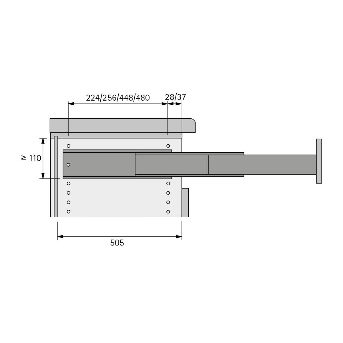 Intégration dans une armoire basse de cuisine a la place d’un tiroir. Dimensions nettes minimales du corps : largeur 360 - 468 mm, profondeur 505 mm, hauteur 110 mm.