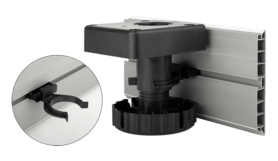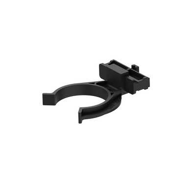 Fixation de moulure de plinthe a encastrer dans une rainure pour clipser sur le pied de plinthe Korrekt (diametre du pied 35mm). Plastique noir/non coloré. Pour hauteur de plinthe a partir de 70 mm. Diametre intérieur de la fixation 33.5mm.