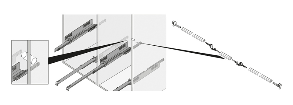 Adaptateur de synchronisation PTO pour l'activation simultanée de deux tiroirs derriere un meme panneau avant. Il relie la synchronisation des tiroirs individuels a travers les côtés communs des deux caissons.