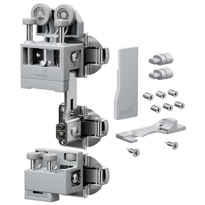 Ensemble de ferrures HETTICH pour porte lourde avec guidage inférieur, 25 kg, gris, droit, avec ressort de fermeture. L'ensemble comprend les pieces pour une porte a 2 vantaux : chariot avec double charniere, guide, couvercle et matériel de fixation. Pour utilisation sans unité d'ouverture. Charnieres pliantes centrales, profils de guidage et charnieres pour fixation murale a commander séparément, voir assortiment associé.