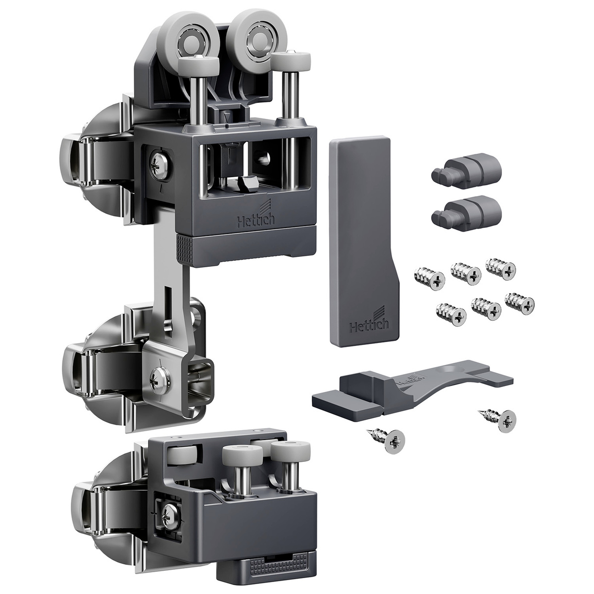 WingLine L, Ensemble de ferrures pour porte lourde avec guidage inférieur, 25 kg, anthracite, gauche, avec ressort de fermeture. L'ensemble comprend des pieces pour une porte a 2 battants : chariot avec double charniere, guide, couvercle et matériel de fixation. Pour usage sans unité d'ouverture. Il est nécessaire de commander séparément les charnieres pliantes centrales, les profils de guidage et les charnieres pour fixation murale, voir assortiment associé.