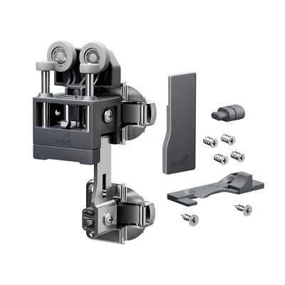 Ensemble de ferrures pour porte légere sans profil de guidage inférieur, 12 kg, anthracite,D avec ressort de fermeture. L'ensemble comprend les pieces pour porte a 2 vantaux : chariot a charniere double, guide, couvercle et matériel de fixation. A utiliser sans unité d'ouverture. Il est nécessaire de commander séparément les charnieres pliantes centrales, les profils de guidage et les charnieres pour fixation au mur, voir assortiment associé.