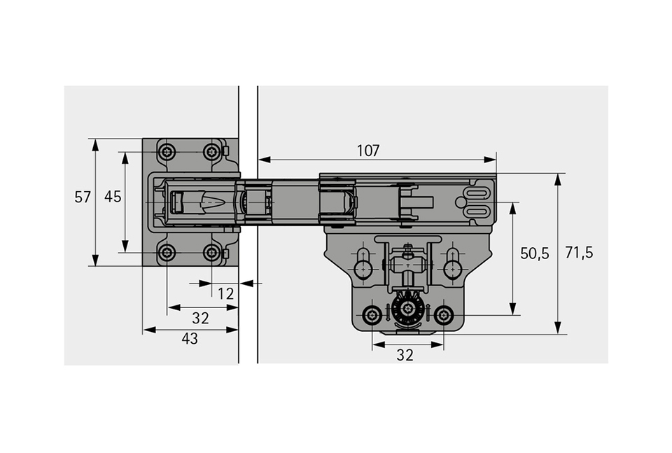 Angle d'ouverture 115°. Peut etre utilisée a gauche ou a De. Pour caissons avec épaisseurs des côtés 16/18/19mm, profondeur d'encastrement 41,5mm. Montage avec vis a bois. Acier galvanisé.