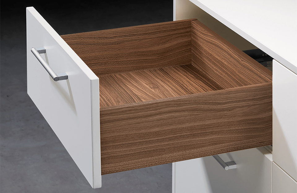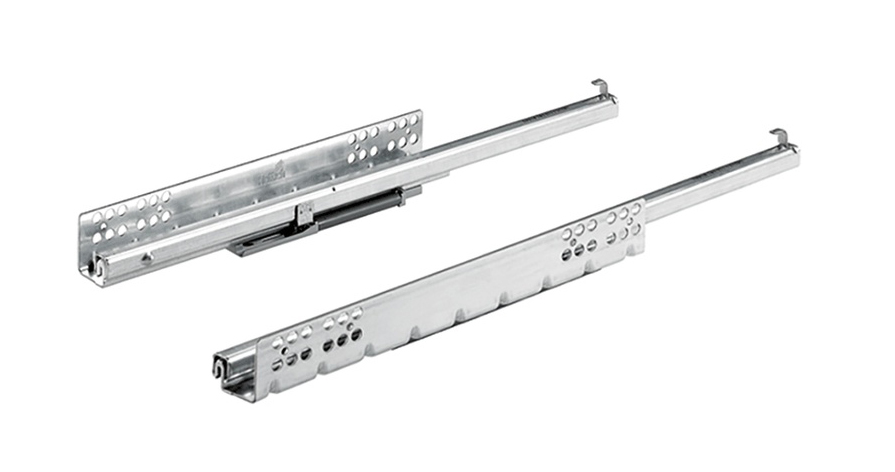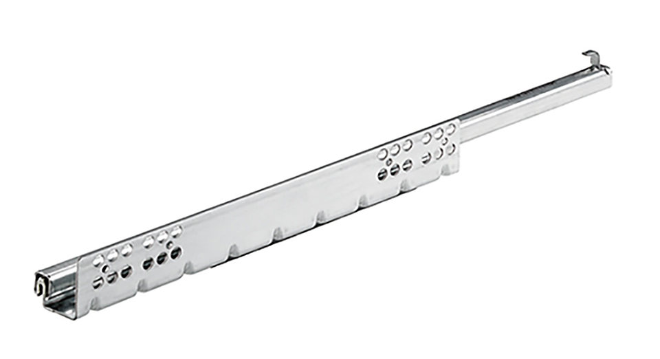 Extension partielle Quadro 25 avec amortissement intégré systeme silencieux pour une épaisseur des côtés du tiroir jusqu'a 19mm. Montage par emboîtement avec raccords et réglage de la hauteur sans utilisation d’outils. Capacité de charge 25kg ; largeur d’encastrement EB23 ; profondeur minimale du corps 563mm.