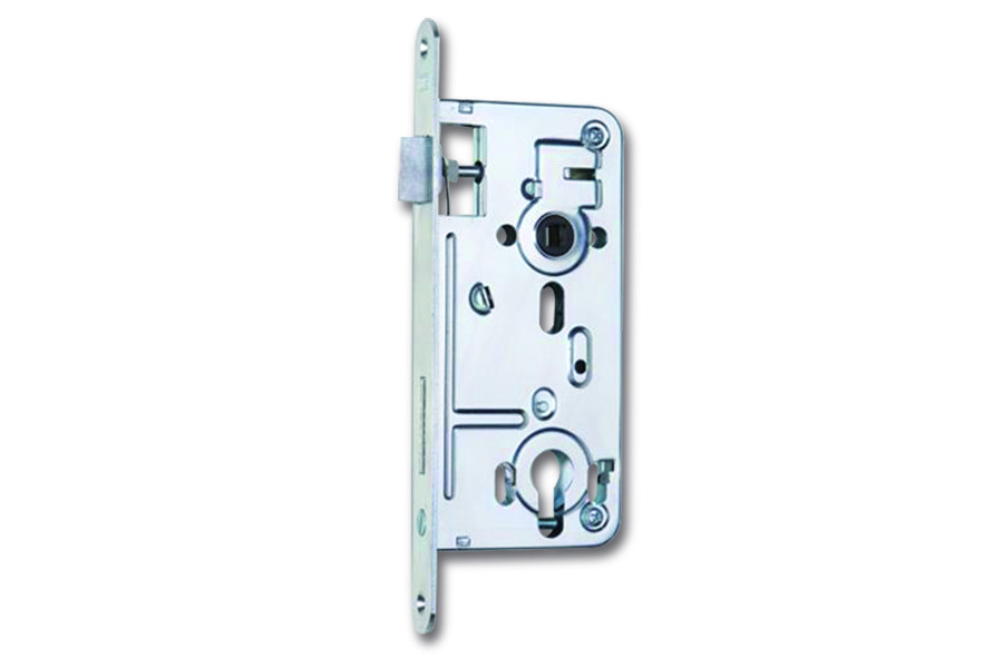 Serrure encastrable de construction Hobes 02-04 pour cylindre (PZ) de profondeur 60mm, entraxe 40mm, espacement 90mm. Finition zinc blanc. Double pene, avec trous pour plaques divisées, avec entraînement. Dimension du chant 230*20mm