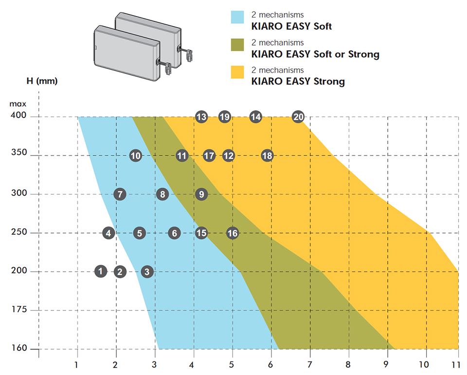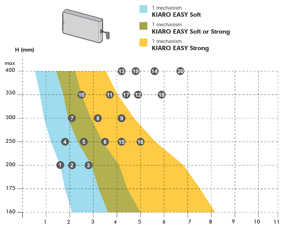 Le systeme Kiaro Easy est symétrique et permet un montage droite/gauche simplement en retournant le mécanisme. La dynamique de l'amortissement (réglage de la force) lors de l'ouverture peut etre facilement ajustée a l'aide d'une vis sur le corps. L'angle d'ouverture standard de 90° peut etre facilement réglé avec une clé Allen dans une plage de -13° (vers le haut) a +7° (vers le bas). Le réglage de l'angle d'ouverture doit etre effectué avant le réglage de la force.