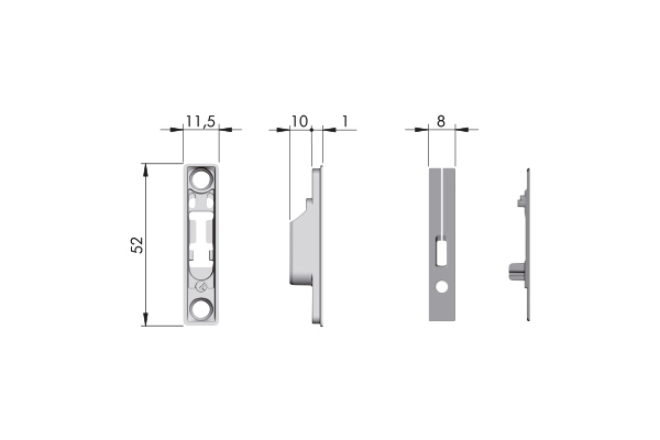 L'emballage comprend également un support de porte en montage en surface (sans besoin de fraisage) ainsi qu'un support fraisée. Pour les cadres en aluminium étroits, il est possible d'utiliser le support fraisée avec un adaptateur pour cadres en aluminium.