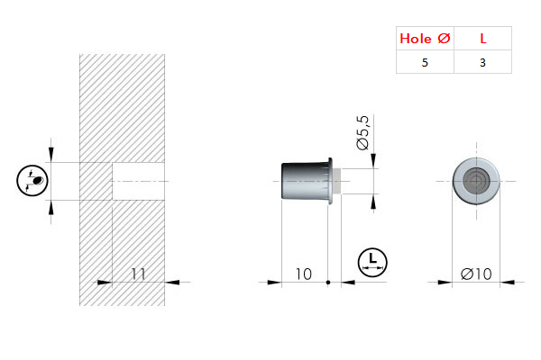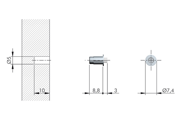 Amortisseur a visser avec couche de silicone pour une absorption de qualité. Pour trou de 5 mm, fraisage de 11 mm. Dimensions extérieures 10 mm, dépassement de 3 mm.