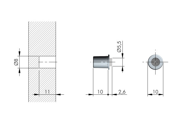 Amortisseur a visser avec couche en silicone pour une absorption de qualité. La partie rigide permet un positionnement facile et sécurisé sur le côté de l'ouverture, aussi bien manuellement qu'avec une machine automatique. Lors de la fermeture de la porte, le choc est délicatement absorbé par l'amortisseur souple extérieur. Pour ouverture 8 mm, fraisage 11 mm. Dimension extérieure 10 mm, dépassement 2,6 mm.