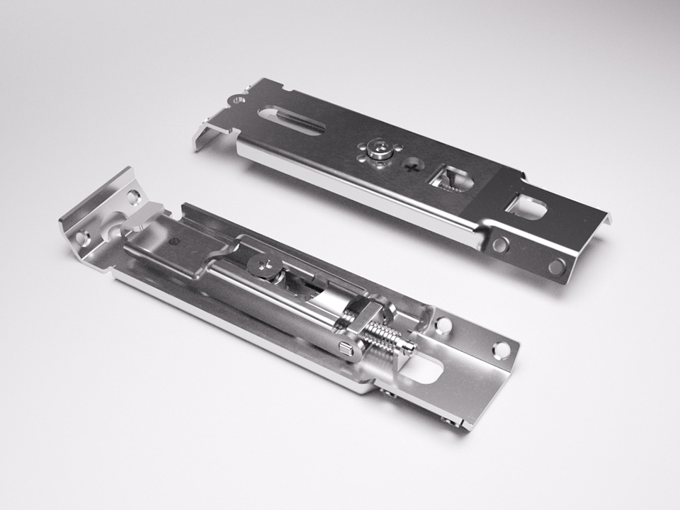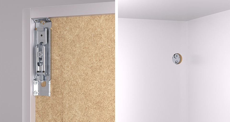 Quincaillerie de réglage pour côté D et gauche, dissimulée derriere la paroi arriere de l’armoire, seul un cache-vis de 20 mm de diametre est visible de la face avant. Montage avec des vis a bois dans la paroi et la structure du corps. Réglage possible en horizontal et en vertical. L’ensemble comprend une paire de quincaillerie, plaques de suspension, cache-vis en plastique blanc et vis pour le corps (6 pcs). Capacité de charge 75 kg/piece, 150 kg par paire