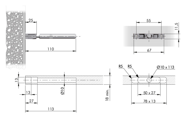 Load capacity of the pair at 200 mm shelf depth: 15 kg Allows three-way adjustment – vertical, lateral and tilt adjustment. Wall mounting using 2 wall plugs of diameter 6 mm and 2 screws size 4,5 mm, drilling spacing 55 mm. Pin diameter 10 mm, pin length 85 mm, total length 110 mm. Minimum thickness of the shelf material: 18 mm. IMPORTANT: The brackets must always be mounted with the marking "TOP–ALTO" facing up.