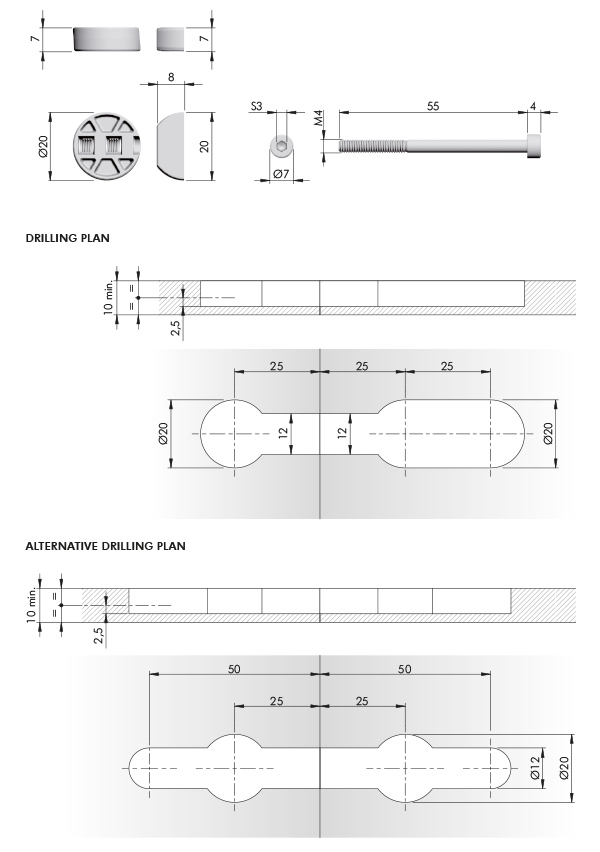 Goujons pour la liaison de panneaux compacts d'une épaisseur minimale de 10 mm. Les trous fraisés doivent toujours avoir un bord arrondi. Les panneaux doivent etre assemblés y compris la lamelle et le joint doit etre étanchéifié avec la colle PD Color Joint. Pour un panneau d'une largeur de 600 mm, il est idéal d'utiliser un ensemble. Outils recommandés, voir assortiment associé - 469489 Meche IMBUS 3,0 - 89 mm avec bille, 469488 Clé en L "L" 3H imbus - 129 x 23 avec bille. 1 ensemble contient 2 pieces de quincaillerie.