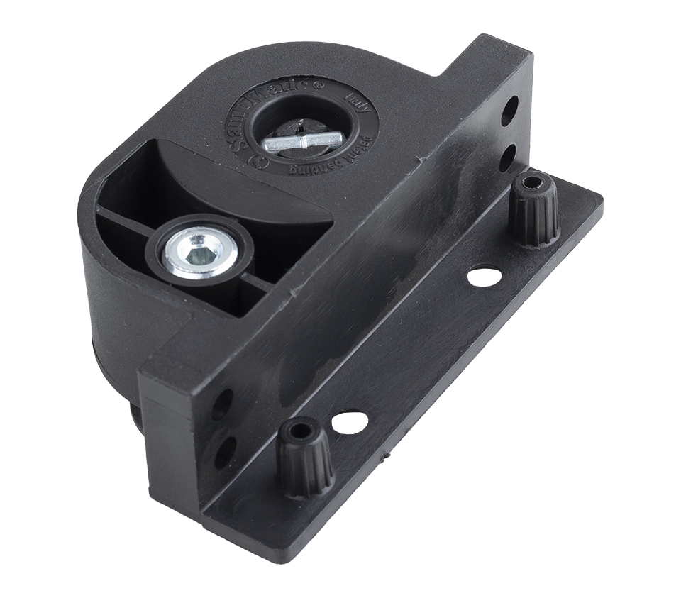 Pied réglable avec roulettes, incluant des goupilles de fixation par percussion dans le corps sur le côté, couleur noire