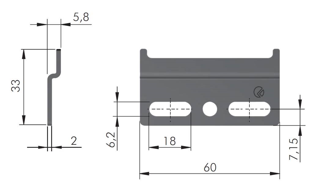Plaque suspendue pour quincaillerie suspendue. Butées contre le glissement latéral de la quincaillerie suspendue. Dimensions L = 60mm, H = 33mm, P = 5,8mm, épaisseur de la tôle 2mm. Matériau tôle galvanisée.