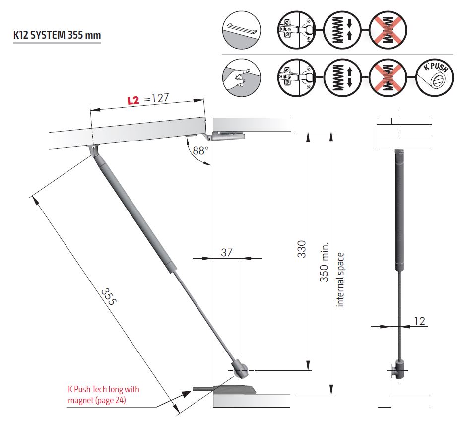 Abattant K12 avec ouverture complete automatique. Pour porte de hauteur 400-600mm. Charge maximale 5,5kg (2 pcs)