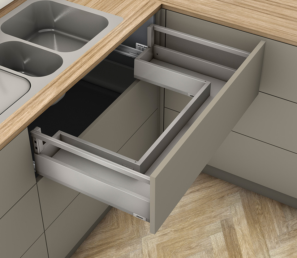 K-BLUM Merivobox, tiroir E reling 550mm/40kg, gris clair IG, vis a bois, évier