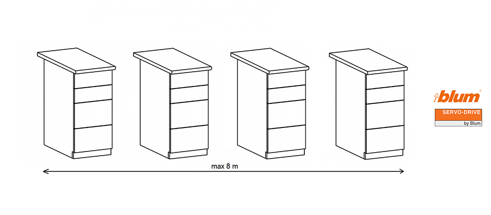 Ensemble ServoDrive pour 4 caissons/16 tiroirs/hauteur maximale de caisson 800mm. Distance maximale entre les caissons extremes 8m. L'ensemble contient tous les composants SERVO-DRIVE nécessaires pour assembler un meuble fonctionnel a ouverture électrique sans poignée (compatible avec Antaro, Legrabox, Tandem et Movento). Utilisez des tiroirs coulissants amortis pour la combinaison avec SERVO-DRIVE.