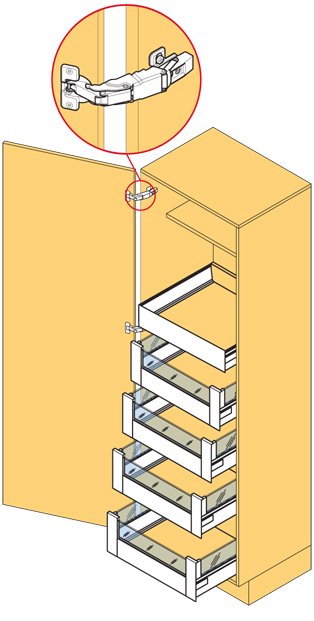 Komplet SpaceTower contient toute la quincaillerie pour une armoire alimentaire s1 avec un tiroir coulissant bas et 4 tiroirs coulissants hauts, y compris la quincaillerie frontale pour tiroirs coulissants intérieurs et le nombre nécessaire de profils frontaux et relings en état non coupé. De plus, des charnieres a recouvrement nul, un amortisseur et des cales pour deux portes. Pour une largeur de corps maximale de 1200 mm.