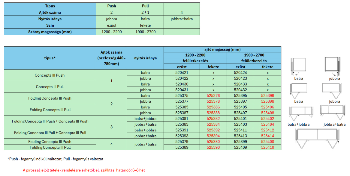 Ensemble complet de quincaillerie pour quatre portes pliantes avec systeme Push a ouverture De et gauche. Capacité de charge 10 - 25kg/aileron. Hauteur de l’aileron 1900 - 2700mm. Largeur de l’aileron 440 - 750mm. Épaisseur du matériau 18 - 26mm. Pour utilisation sans poignée. Couleur argent anodisé.