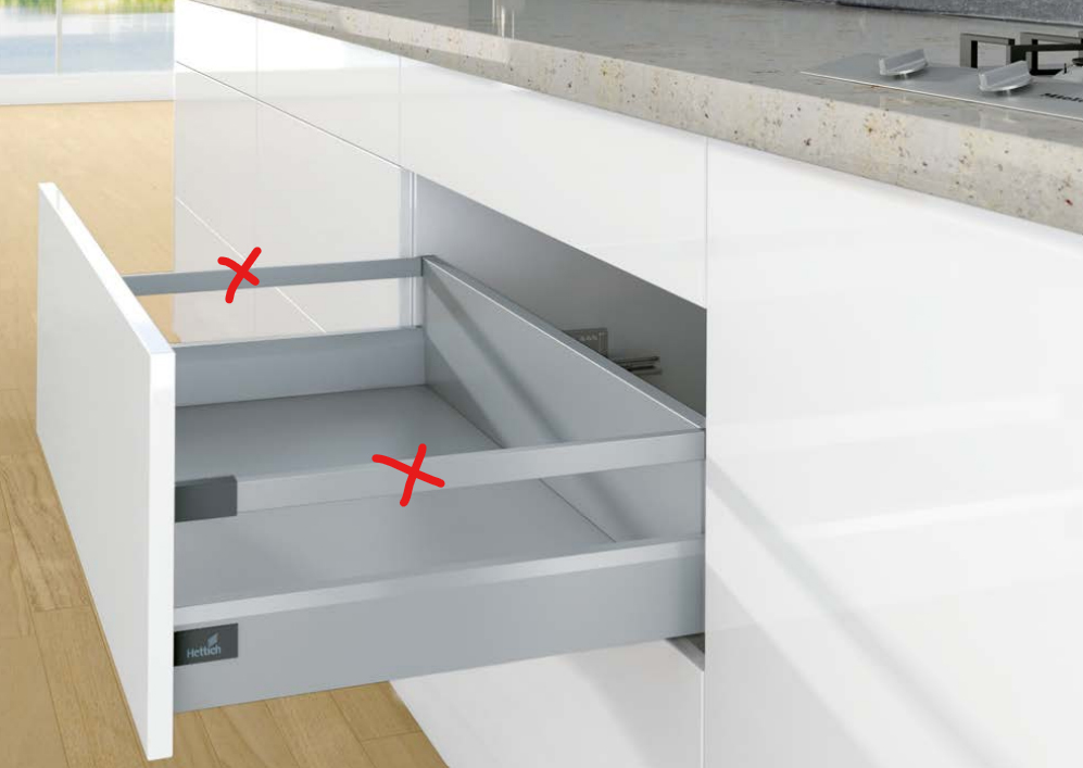 Quincaillerie pour tiroir avant ArciTech en couleur argent, profondeur des tiroirs coulissants 350mm, hauteur du côté 94mm, hauteur totale 186mm, capacité de charge des tiroirs 40kg, amortissement SiSy. L'ensemble comprend 1 paire de côtés, 2 pcs de quincaillerie avant (chevilles), 2 pcs de caches Hettich, 2 pcs de supports arriere 186mm. Le tiroir doit etre complété par des relings, ou TopSide, ou DesignSide. Pour l'ouverture sans poignée P2OS, il faut ajouter le module correct P2O ; si le tiroir a une largeur supérieure a 600mm, il est nécessaire d'ajouter une barre de synchronisation (318279) a couper = largeur intérieure du corps - 2xEB - 207.