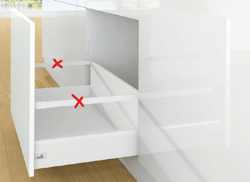 Quincaillerie pour tiroir frontal ArciTech en couleur blanche, profondeur des tiroirs 300 mm, hauteur du côté 126 mm, hauteur totale 282 mm, capacité de charge des tiroirs 40 kg, amortissement SiSy. L'ensemble comprend 1 paire de côtés, 2 pieces de quincaillerie frontale (chevilles), 2 caches Hettich, 2 supports arriere 282 mm. Le tiroir doit etre complété par des relings, ou TopSide, ou DesignSide. Pour une ouverture sans poignée P2OS, il est nécessaire d'ajouter le module correct P2O ; si le tiroir dépasse 600 mm de largeur, il faut ajouter une barre de synchronisation (318279) coupe = largeur intérieure du corps - 2xEB-207.