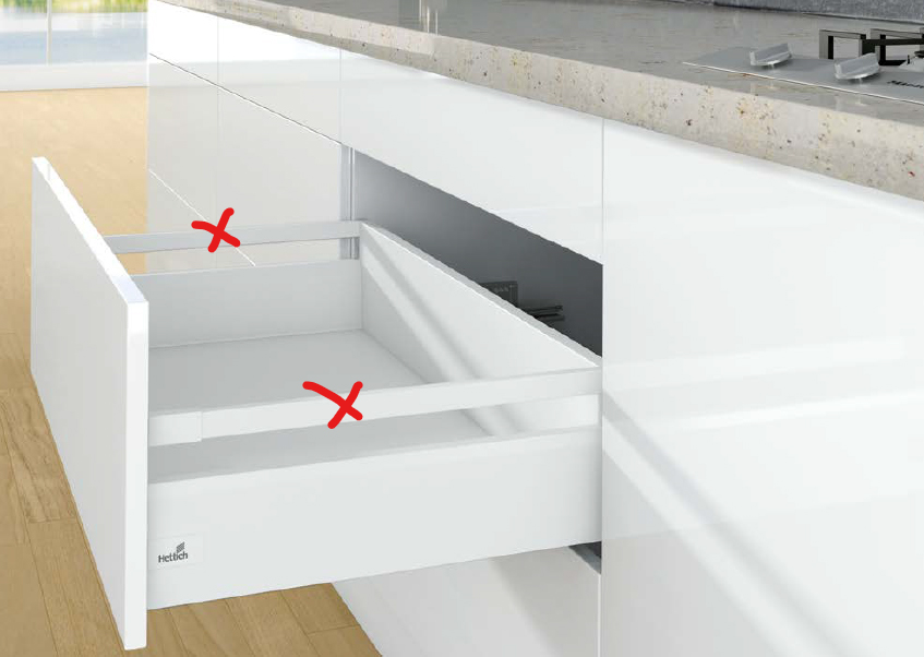 Quincaillerie pour tiroir frontal ArciTech en couleur blanche, profondeur des tiroirs 550mm, hauteur du côté 126mm, hauteur totale 186mm, capacité de charge des tiroirs 40kg, amortissement SiSy. L'ensemble comprend 1 paire de côtés, 2 pcs de quincaillerie frontale (chevilles), 2 pcs de caches Hettich, 2 pcs de supports arriere 186mm. Le tiroir doit etre complété par des relings, ou TopSide, ou DesignSide. Pour une ouverture sans poignée P2OS, il est nécessaire d'ajouter le bon module P2O ; si le tiroir est plus large que 600mm, il faut ajouter une barre de synchronisation (318279) découpage = largeur intérieure du corps - 2xEB - 207.