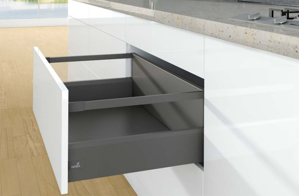 Quincaillerie pour tiroir avant ArciTech en couleur anthracite, profondeur de tiroirs 450mm, hauteur du côté 126mm, hauteur totale 250mm, capacité de charge des tiroirs 40kg, amortissement SiSy. L'ensemble comprend 1 paire de côtés, 2 pcs de quincaillerie avant (chevilles), 2 pcs de caches Hettich, 2 pcs de supports arriere 250mm. Le tiroir doit etre complété par des relings, ou TopSide, ou DesignSide. Pour une ouverture sans poignée P2OS, il est nécessaire de compléter avec le module correct P2O, dans le cas ou le tiroir est plus large que 600mm, il est nécessaire d'ajouter une barre de synchronisation (318279) coupe = largeur intérieure du corps - 2x EB - 207.