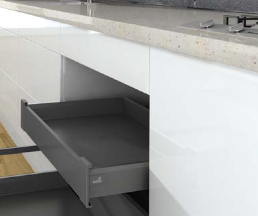 Quincaillerie pour tiroir intérieur ArciTech en couleur anthracite, profondeur des tiroirs coulissants 650 mm, hauteur côté 94 mm, capacité de charge des tiroirs coulissants 40 kg, amortissement SiSy. L’ensemble comprend 1 paire de côtés, 2 plaques frontales de fixation (nécessite un complément avec plaque frontale réf. 301000, hauteur 70 mm, longueur 2000 mm, coupe = largeur intérieure du corps - 2xEB - 62), 2 caches Hettich, 2 supports arriere. Pour l’ouverture sans poignée P2OS, il est nécessaire d’ajouter le module P2O approprié ; si le tiroir est plus large que 600 mm, il faut ajouter une barre de synchronisation (318279), coupe = largeur intérieure du corps - 2xEB - 207.