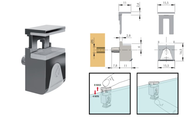 Support de tablette élégant pour étageres en verre 4-8mm.