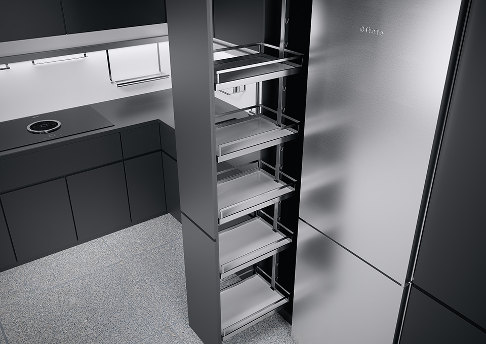 ... est un produit qui, grâce a des étageres suspendues individuellement et réglables en hauteur, assure une capacité optimale sur une surface minimale. Toute la hauteur et la largeur de l'armoire peuvent etre pleinement utilisées. Cela crée un espace, de l'ordre et une visibilité en meme temps - et pas seulement dans la cuisine. Meme sur les étageres supérieures, tout est toujours a portée de vue - et cela des deux côtés !