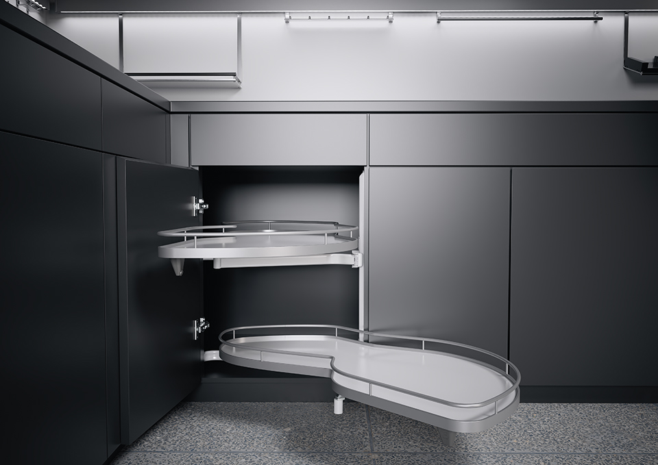 Grâce a la géométrie spécialement conçue des étageres, il augmente la surface de rangement réelle jusqu'a 70 %. Un avantage évident par rapport aux armoires a tiroirs coulissants comparables. Lorsque LeMans II est équipé d’un mécanisme amorti, disponible en option, le mouvement des étageres est presque silencieux. Ce confort optimal peut etre facilement et rapidement ajouté a tout moment.