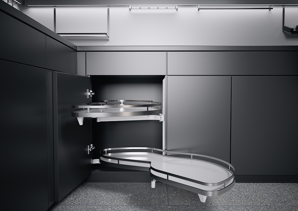 Grâce a la géométrie spécialement conçue des étageres, la surface de rangement réelle est augmentée jusqu'a 70 %. Un avantage clair par rapport aux armoires a tiroir coulissant comparables. Lorsque LeMans II est équipé d'un mécanisme amorti, disponible en option, le mouvement des étageres est quasi silencieux. Ce confort optimal peut etre facilement et rapidement ajouté a tout moment.