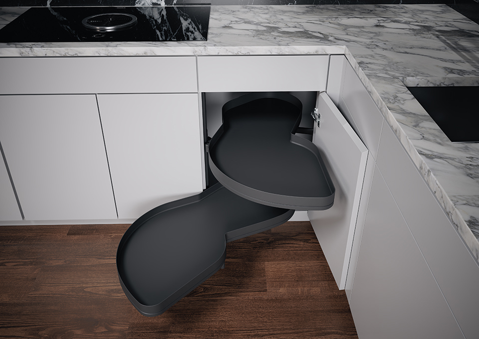 Grâce a la géométrie spécialement conçue des étageres, la surface de rangement réelle augmente jusqu'a 70 %. Un avantage net par rapport aux armoires a tiroirs coulissants comparables. Si le LeMans II est équipé d'un mécanisme amorti, disponible en option, le mouvement des étageres est presque silencieux. Ce confort optimal peut etre facilement et rapidement ajouté a tout moment.