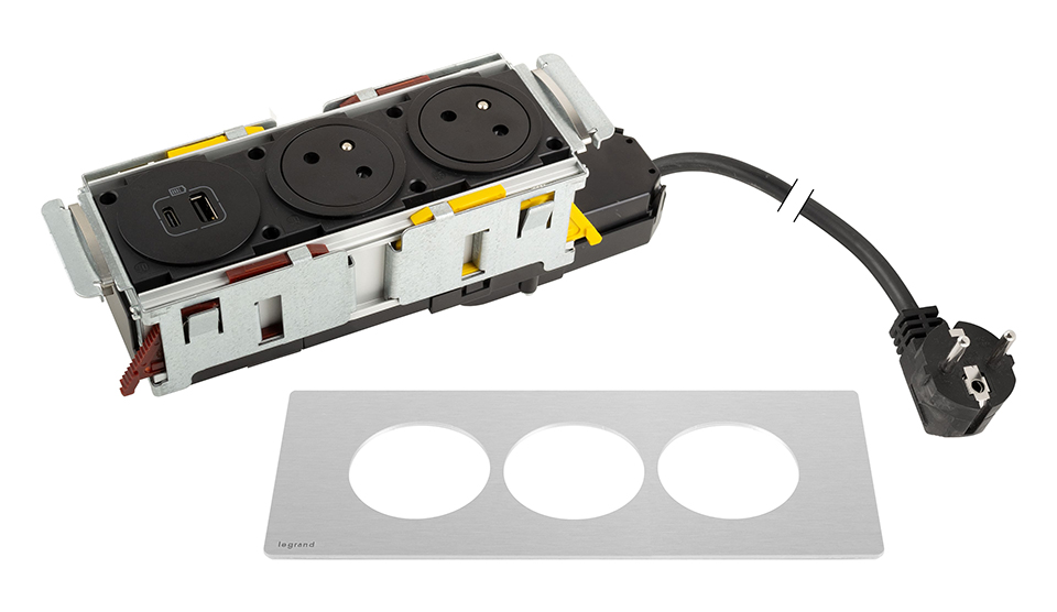 K- LEGRAND prise électrique Disq´In 2x 230V FR + 1x USB A+C, noir/inox