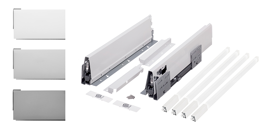 Tiroir coulissant avec amortissement et flanc creux, comprenant 2 paires de relings carrés. Longueur 500 mm, hauteur 204 (225 mm). Capacité de charge jusqu'a 35 kg. Couleur blanche. Tout le nécessaire pour assembler un tiroir avant est inclus dans ce set. Pour un tiroir intérieur, il est nécessaire de commander séparément le panneau avant.