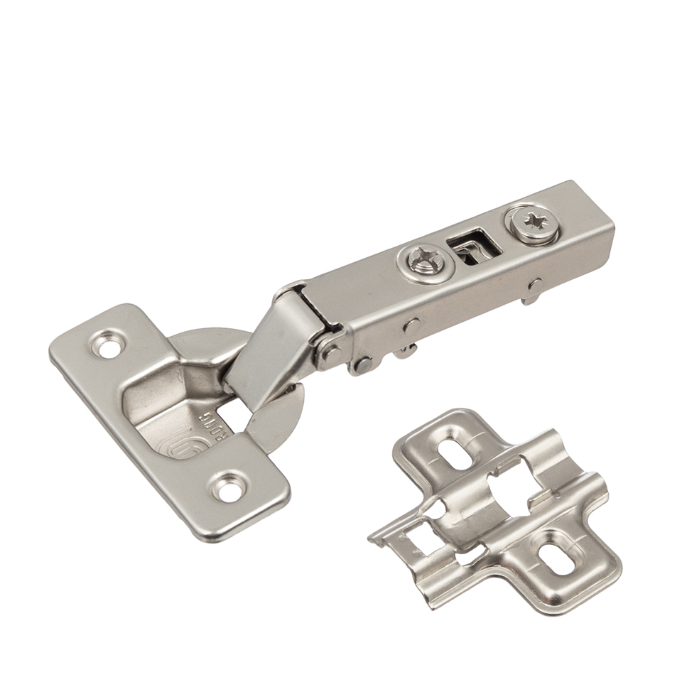 Ensemble complet de charniere S5 avec plaque de montage. Charniere avec ressort de fermeture (construction two-way), angle d’ouverture de 110°, fixation de la cuvette par vis et réglage de profondeur excentrique.