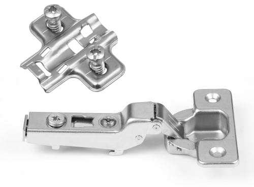 Ensemble complet de charniere S5 avec plaque de montage. Charniere avec ressort de fermeture (construction two-way), angle d’ouverture de 110°, fixation de la cuvette par vis et réglage de profondeur excentrique.